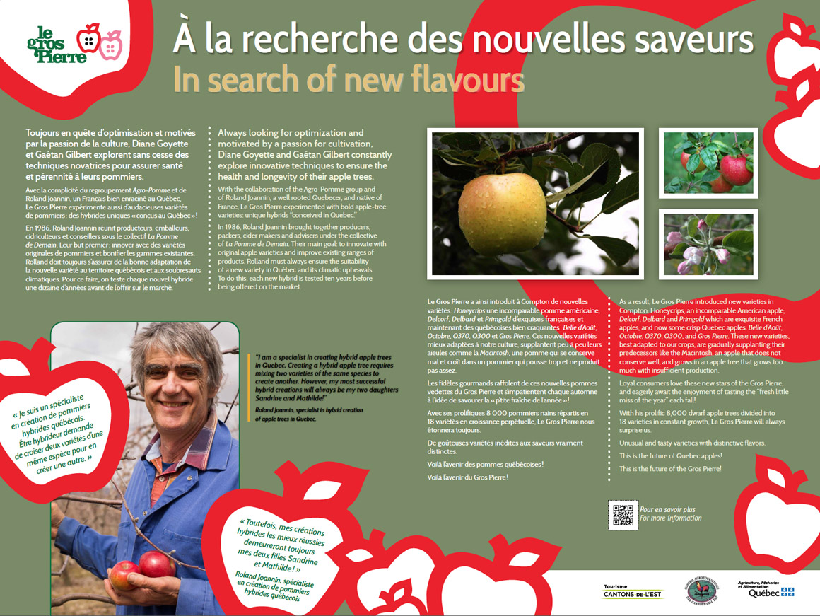 Grâce à l’aide du regroupement Agro-Pomme et de Rolland Joannin, un Français bien enraciné au Québec, Le Gros Pierre cultive de nouvelles variétés de pommiers : des hybrides «faits au Québec».